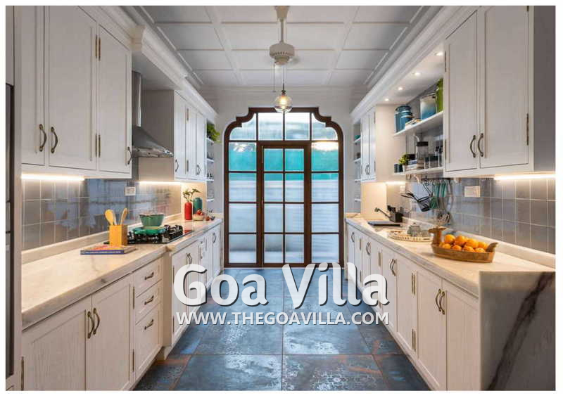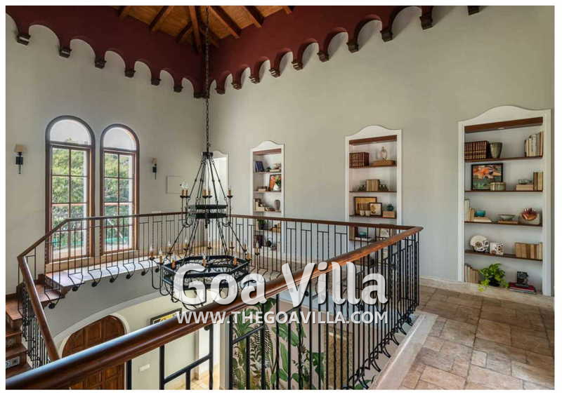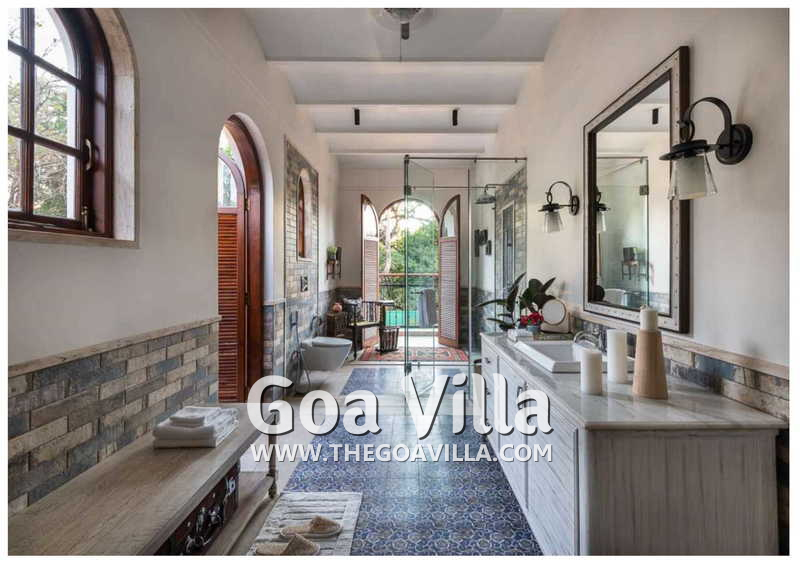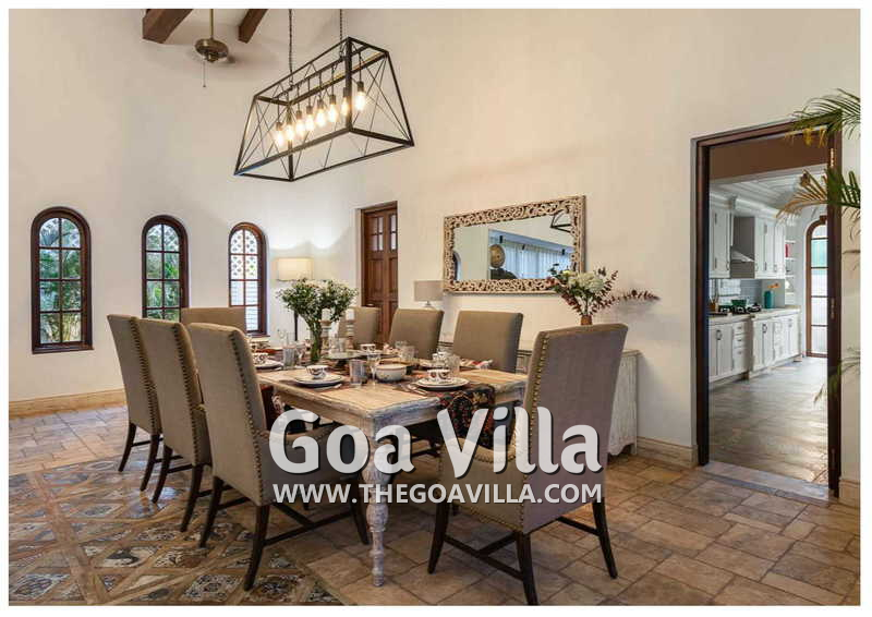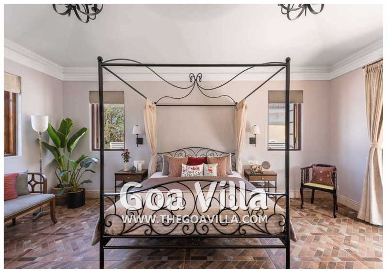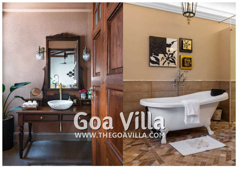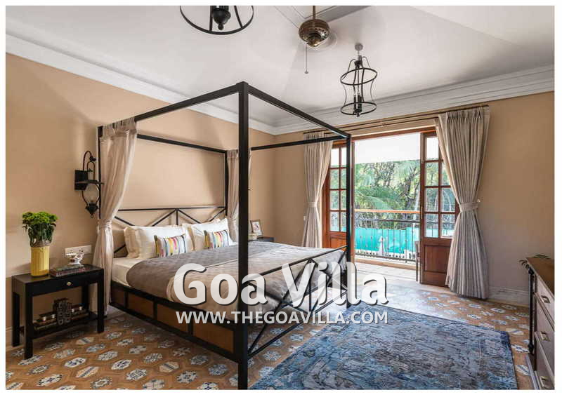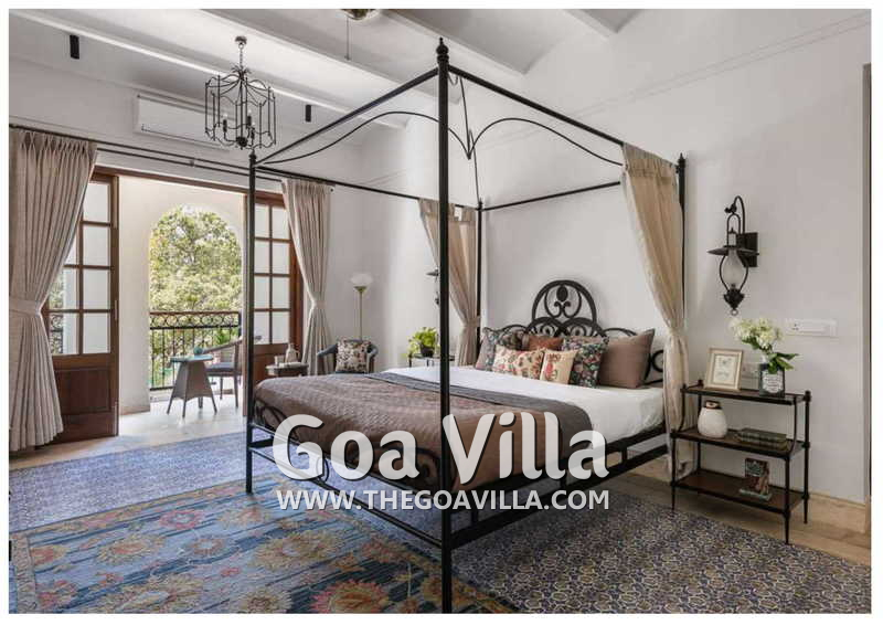 Swimming Pool – Another reason that makes this luxury villa in Goa truly spectacular is its impressive outdoor area. Its central courtyard features a garden, manicured lawn, and a private swimming pool with a shallow end. Several loungers and garden chairs are placed on the green patch beside the pool. At one end of the pool, you will also find a Jacuzzi. A shaded verandah runs through the other side with a beautiful seating arrangement.