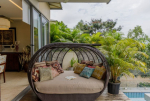 Swimming Pool – The outdoor area is an oasis of peace and tranquility. Here, you will be surrounded by lush greenery. The private swimming pool and its poolside deck look very inviting. There is a daybed in the middle of the pool where you may want to lie down anytime you want. The water around this is shallow, so even the kids can have fun here. The pool deck has several chairs where you can also relax. On the other side, you will find many decorative plants and a big East Asian sculpture.