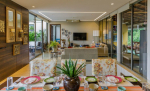 Dining, Kitchen – A glass panel separates the dining and living areas. The table can seat up to 8 guests. This luxury holiday villa also has a large modern kitchen with cooking equipment. Utensils and cutlery is provided. You can cook yourself, ask for the services of a professional chef, or order food from outside. There are many good restaurants nearby.