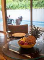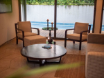 Living Room – The interior is warm and inviting. It has a large sofa and also chairs that are arranged a Bose sound system and a large-screen television. It is air-conditioned for your comfort. The living room opens to the poolside patio.