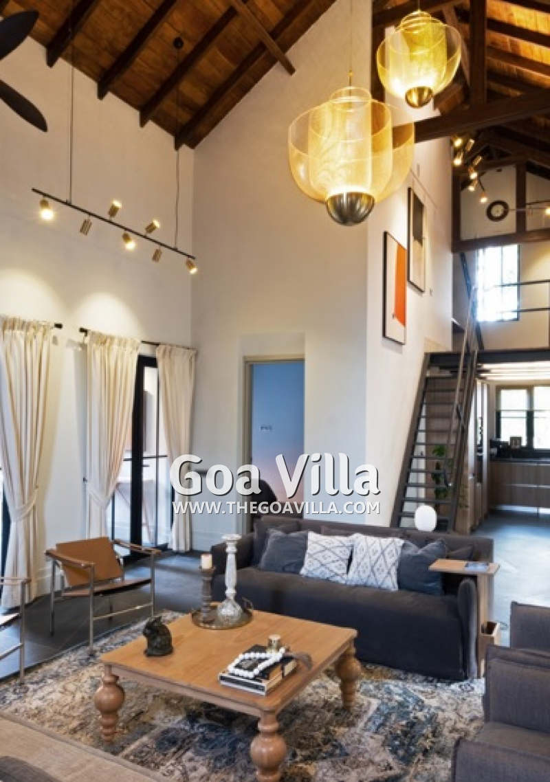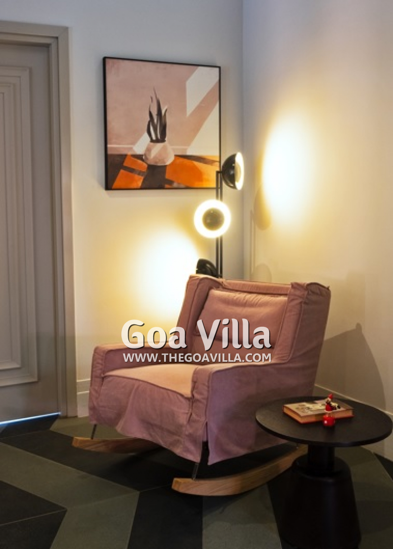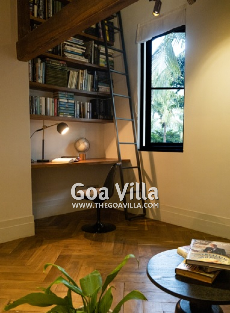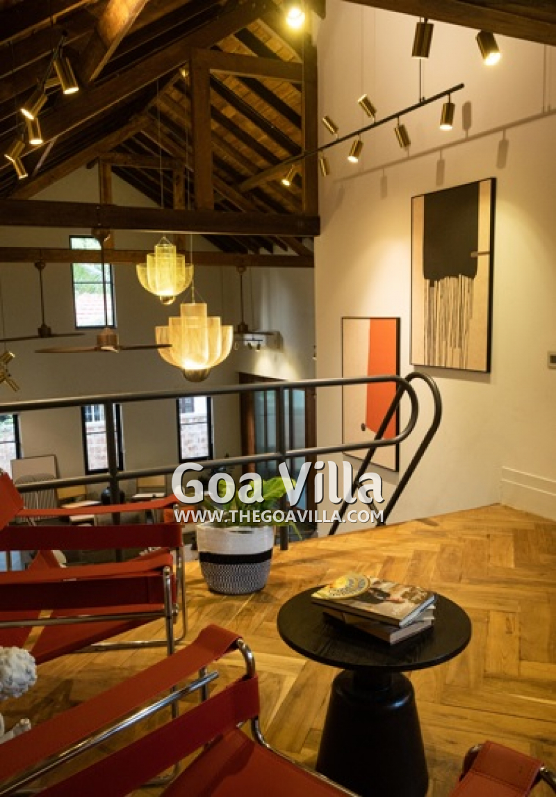 Living Room – Villa Tamarind Boutique has several lounging areas. The formal living area is huge. It has plenty of chairs and sofas for the entire group. Guests staying at this north Goa property love to spend time here. There is a second, smaller living area with a bright-colored sofa around a modern coffee table. A retractable ladder goes to the attic, where you will find a library, a cozy table, and the reading section.