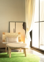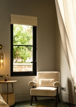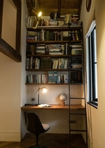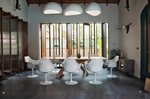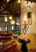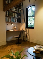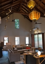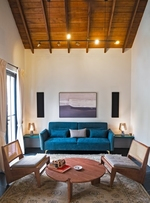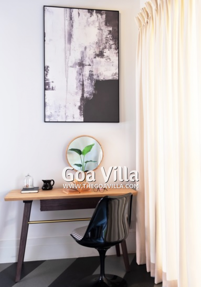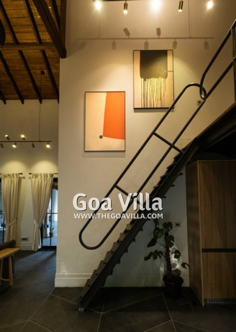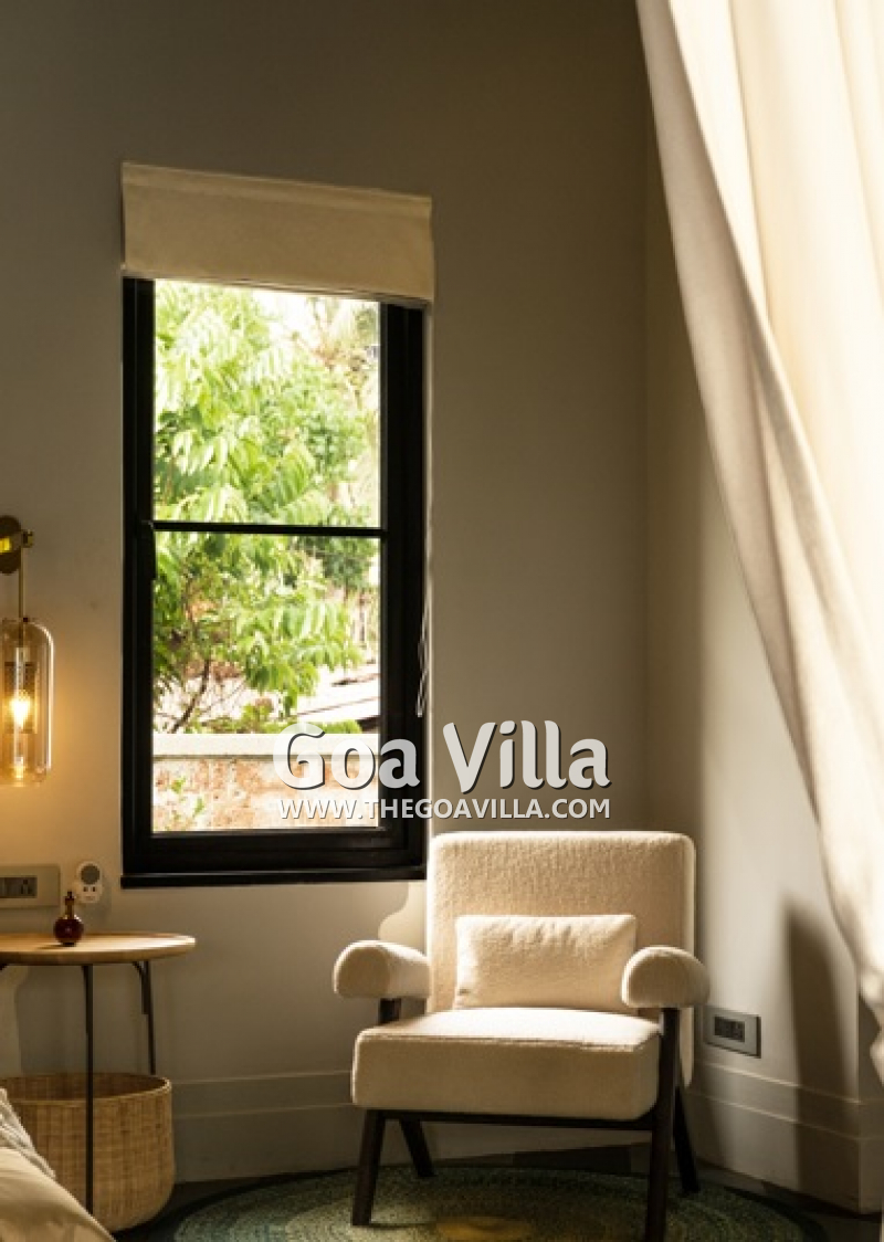 Living Room – Villa Tamarind Boutique has several lounging areas. The formal living area is huge. It has plenty of chairs and sofas for the entire group. Guests staying at this north Goa property love to spend time here. There is a second, smaller living area with a bright-colored sofa around a modern coffee table. A retractable ladder goes to the attic, where you will find a library, a cozy table, and the reading section.