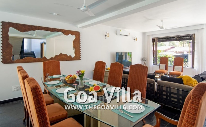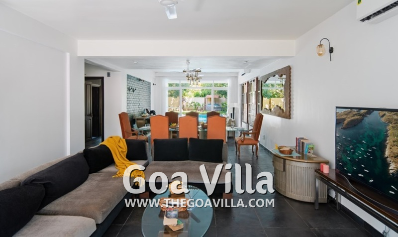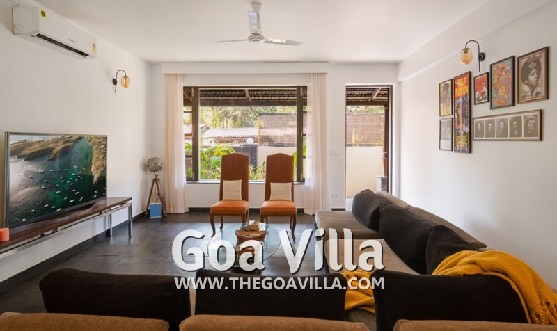 Living Room – The living room is unique because it is open on both the sides. There are two doors that lead to the garden and pool on either end. You will find two separate sofa areas, both offering comfortable seating. One has a huge 35-inch television. You can spend your evening here and even the days here, relaxing, and having a good time together with your friends or family. The room features a wonderful décor.