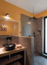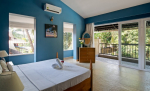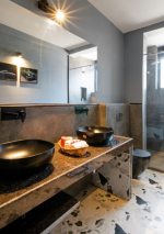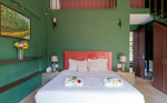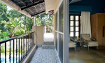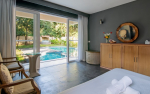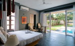 Bedrooms – The four bedrooms are spread over two floors. The ground floor has one bedroom with a king bed, bedside tables with reading lamps, a wardrobe, and armchairs. One entire wall has a ceiling-to-floor glass door that opens directly to the pool and garden. You cannot stay closer to the green outdoor of the villa and its pool. The upper floor bedrooms all have a similar décor and large double beds. Bedroom #2 has its own private balcony. Bedroom #3 opens to a huge private terrace. Bedroom #4 has a huge window that offers views of the banyan tree. So, each bedroom in the house is unique in its own way.