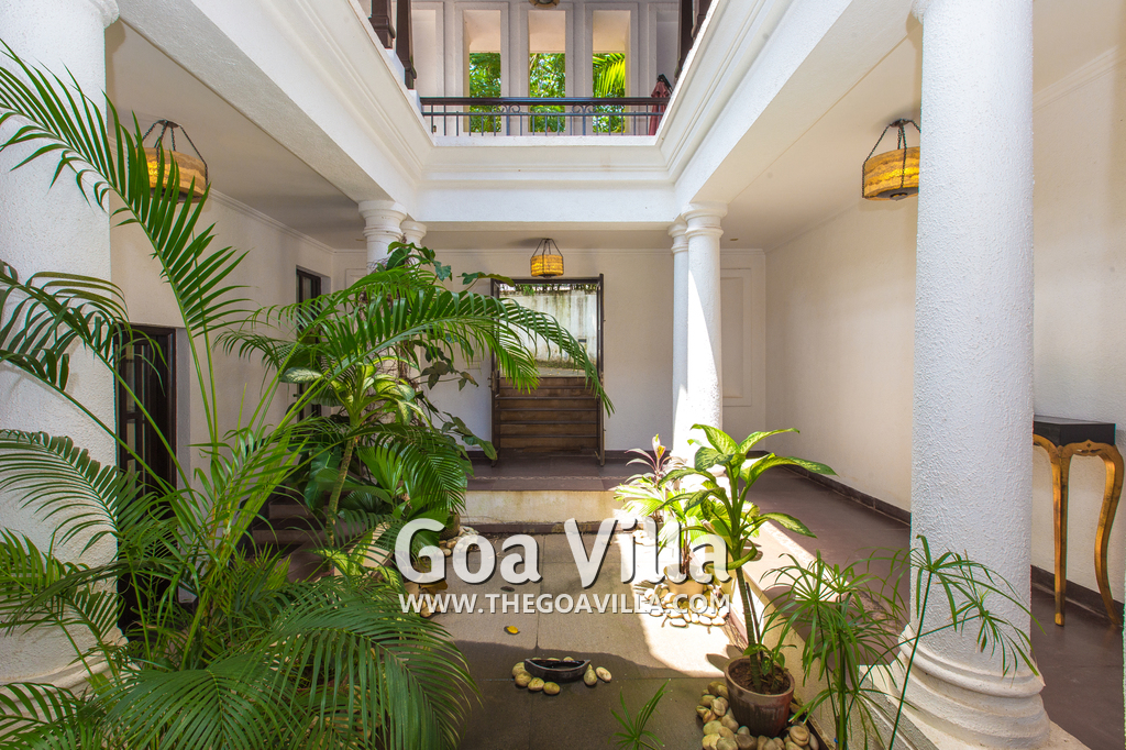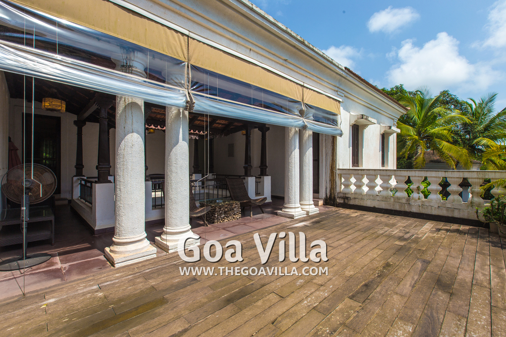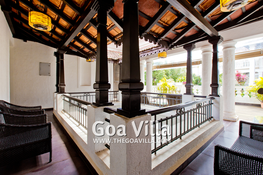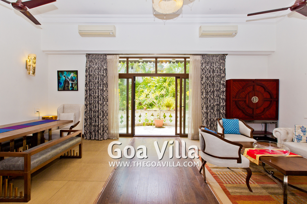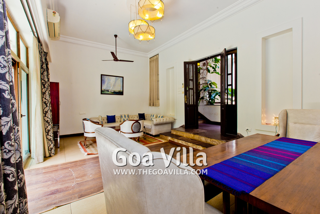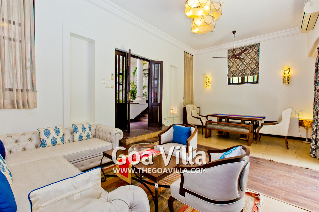 Living Room – Open plan ground floor living room. There is a comfortable sofa, center table, carpet. Beautiful chandelier hangs from the top. It leads to a traditional Goan covered balcony outside and a terrace. There is a small covered sitting area in the terrace as well. You will also find traditional columns. Hardwood flooring. Whitewashed walls provide a soothing touch. 2 air conditioners keep this space cool.