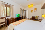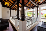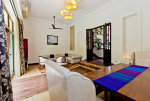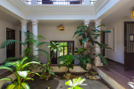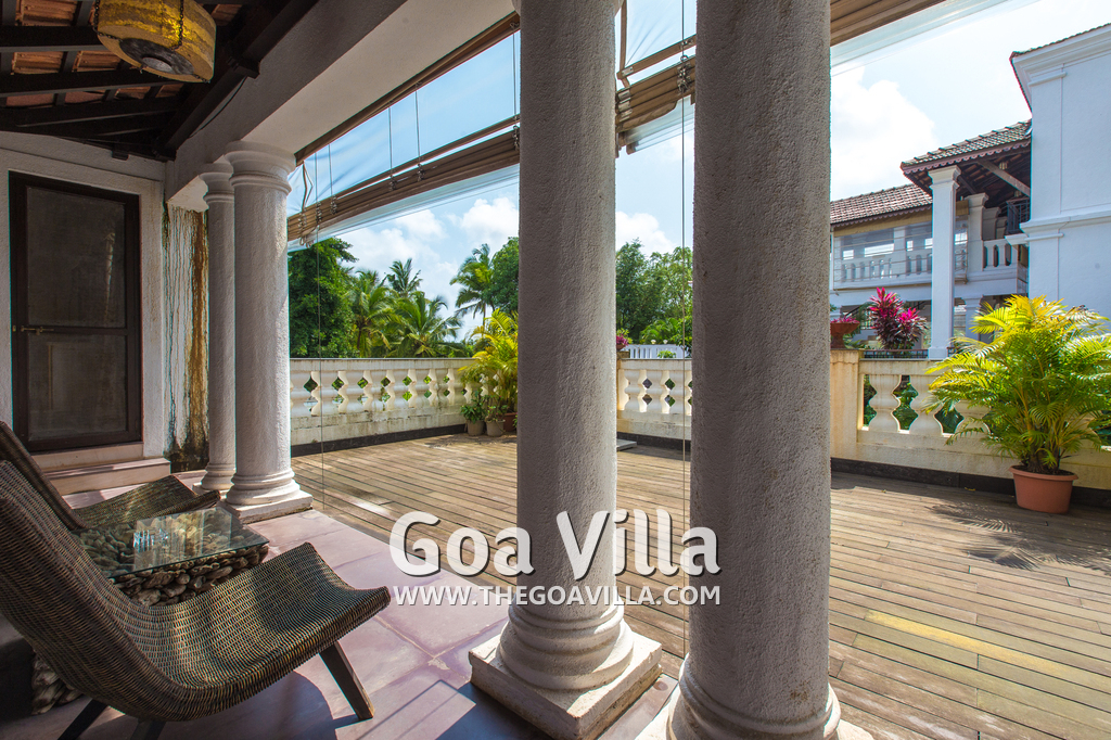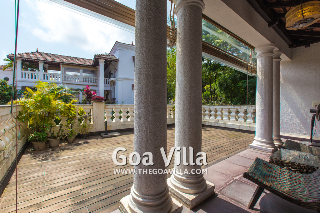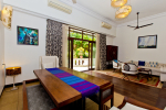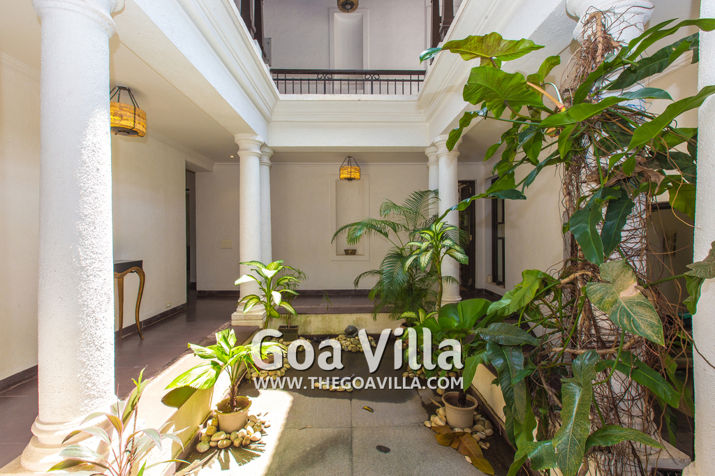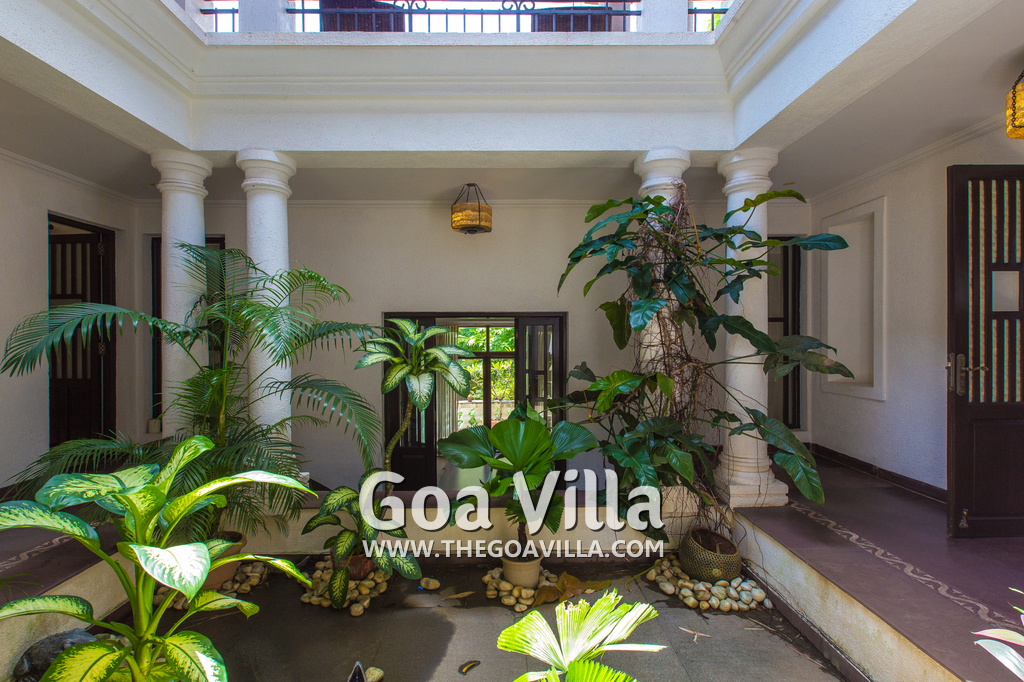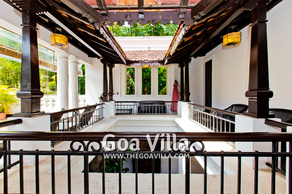 Living Room – Open plan ground floor living room. There is a comfortable sofa, center table, carpet. Beautiful chandelier hangs from the top. It leads to a traditional Goan covered balcony outside and a terrace. There is a small covered sitting area in the terrace as well. You will also find traditional columns. Hardwood flooring. Whitewashed walls provide a soothing touch. 2 air conditioners keep this space cool.