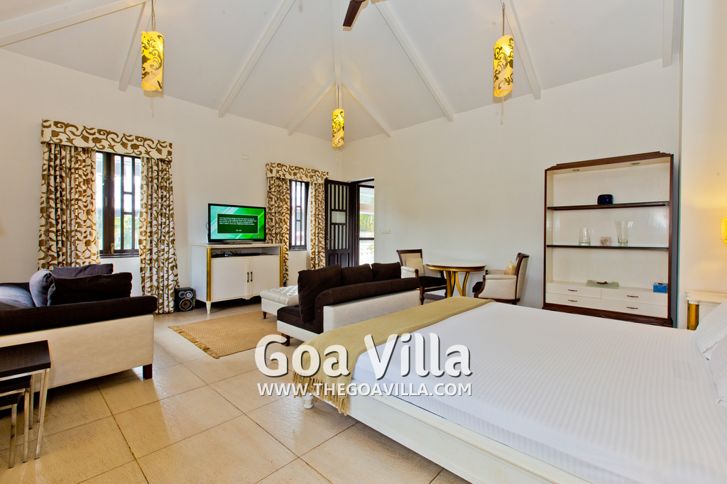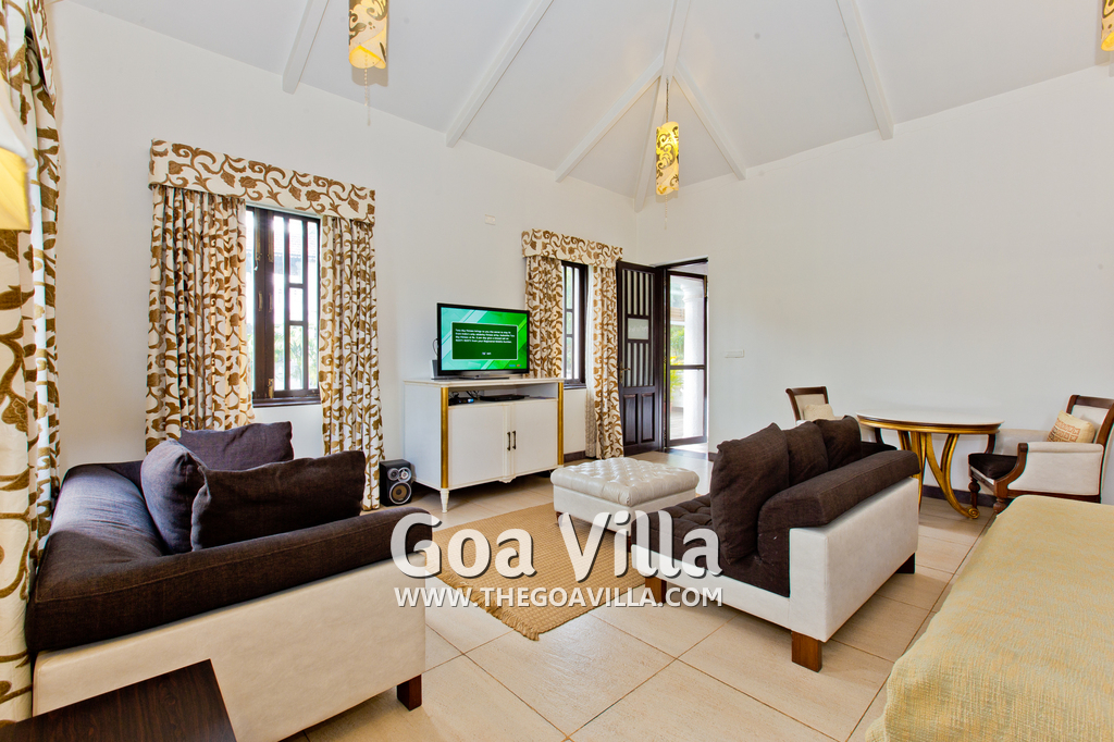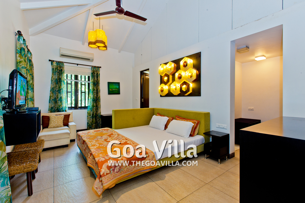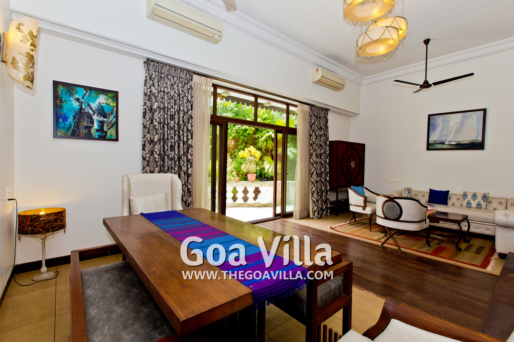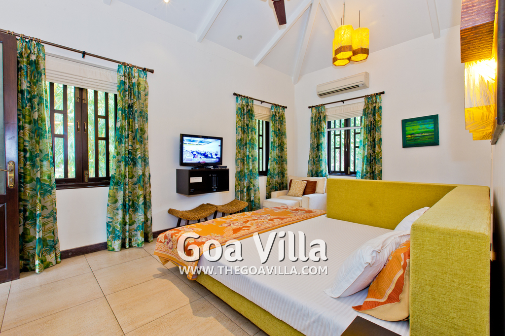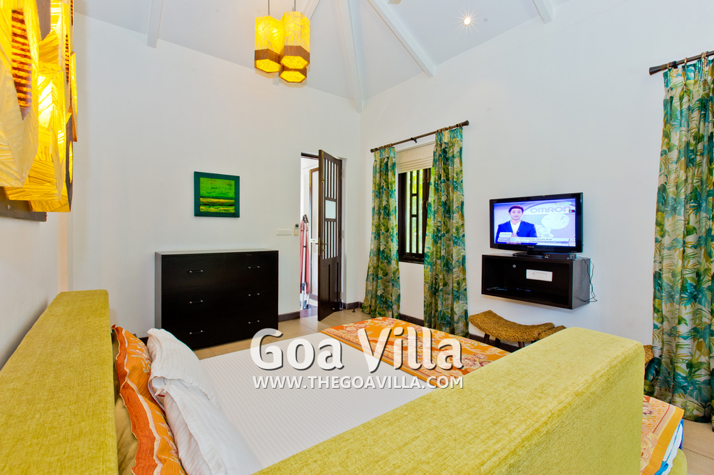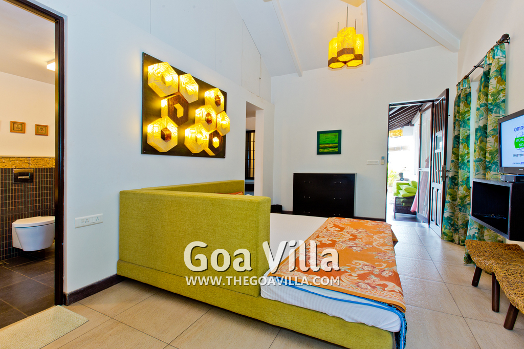 Bedrooms – This North Goa holiday villa for rent has 3 bedrooms, all en-suite and air-conditioned. Larger than your average hotel bedroom. They have king beds, side tables, beautiful lamp shades, wardrobe, study table, and television. Paintings on the wall. Bedroom #2 is the master suite. It has more space with a private sitting area, comfortable sofa, and a table where you can have snacks. Beautifully printed drapes on the windows. Space for floor mattress to accommodate more guests.