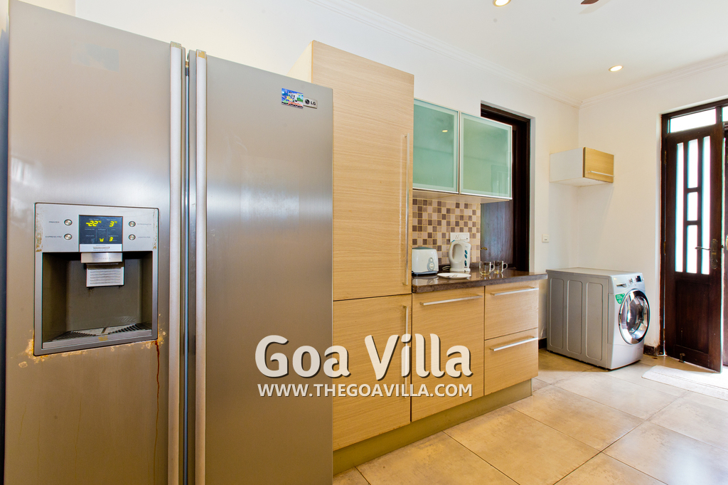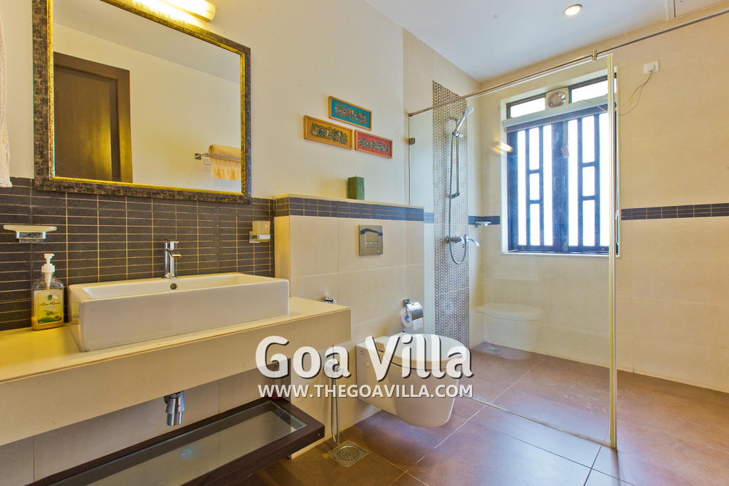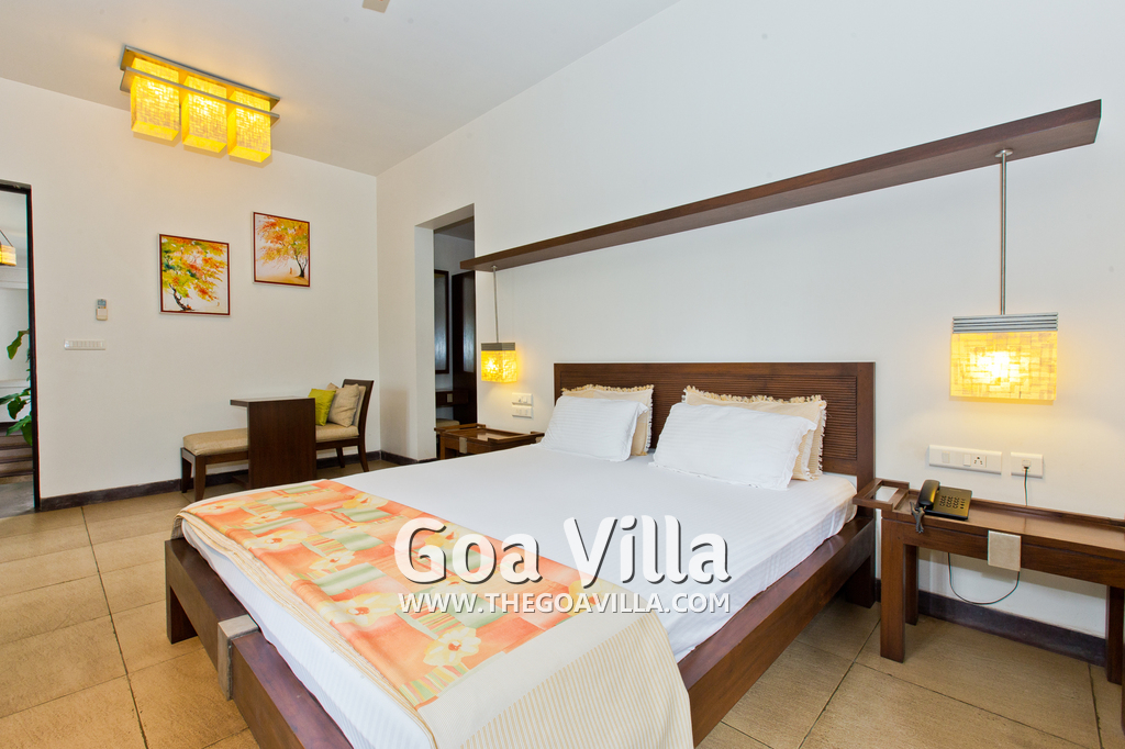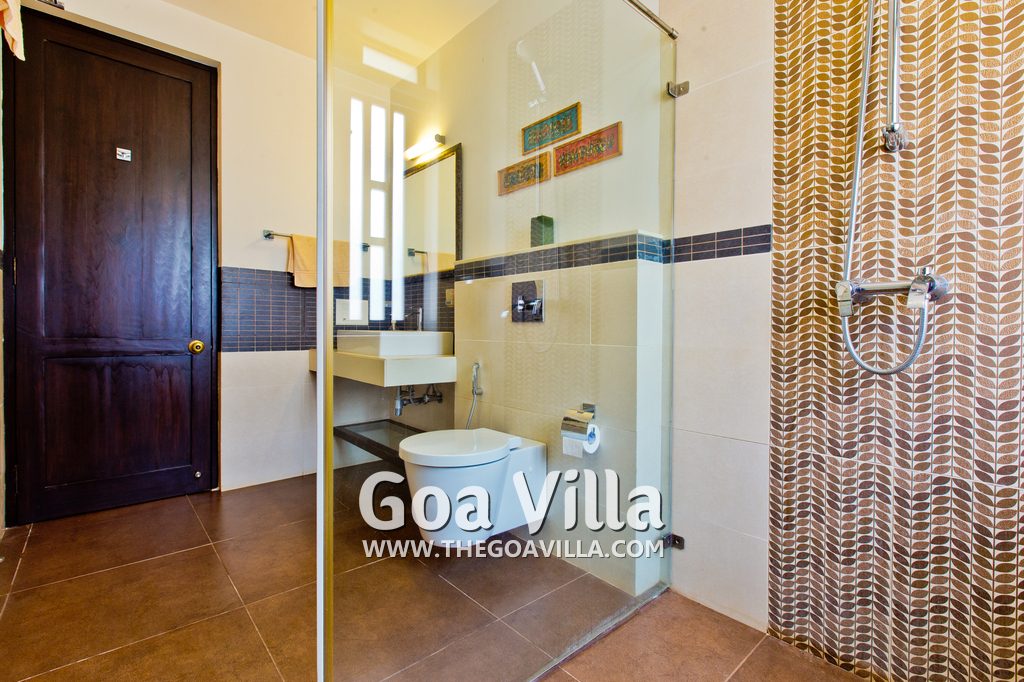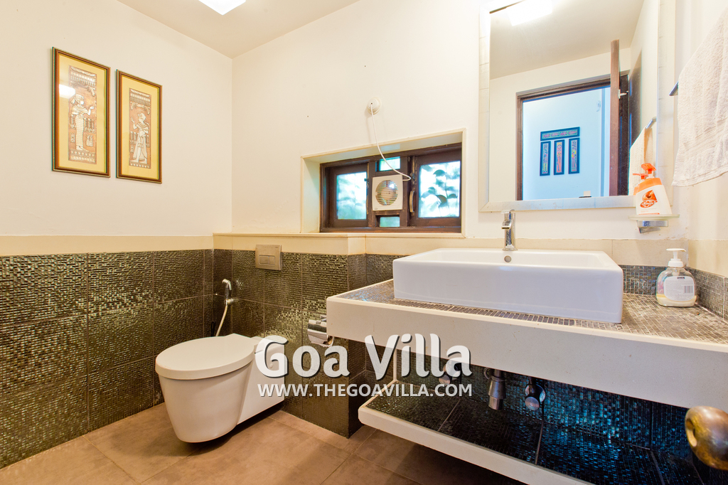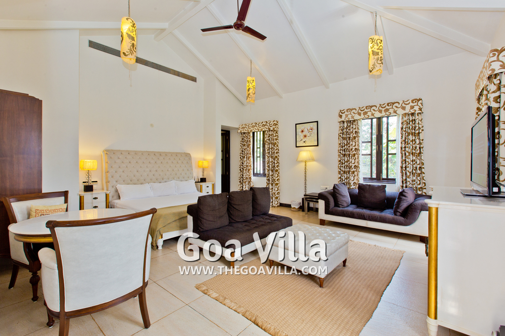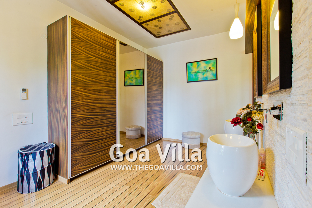 Bedrooms – This North Goa holiday villa for rent has 3 bedrooms, all en-suite and air-conditioned. Larger than your average hotel bedroom. They have king beds, side tables, beautiful lamp shades, wardrobe, study table, and television. Paintings on the wall. Bedroom #2 is the master suite. It has more space with a private sitting area, comfortable sofa, and a table where you can have snacks. Beautifully printed drapes on the windows. Space for floor mattress to accommodate more guests.