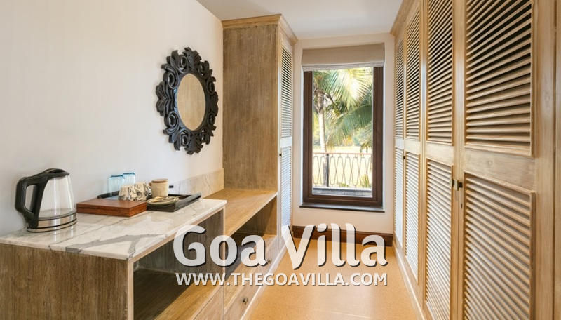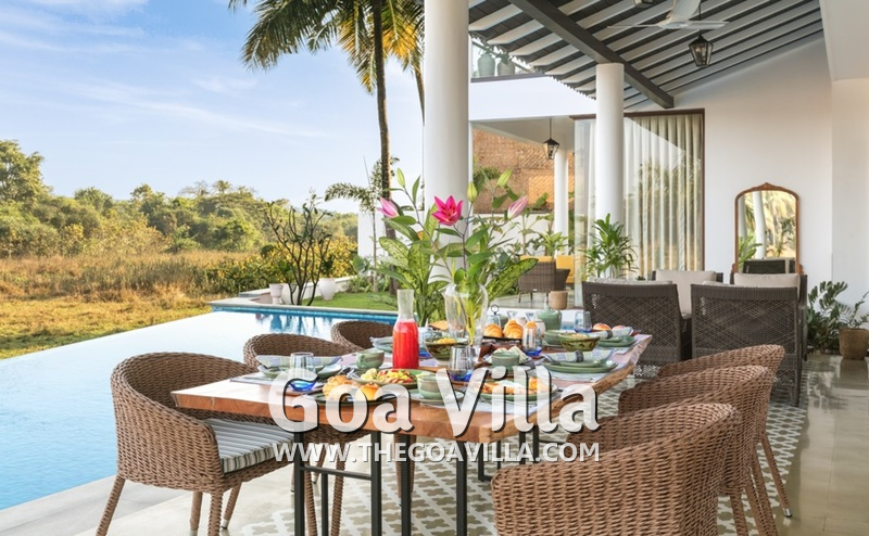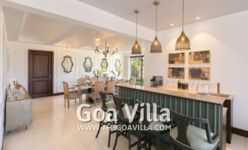 Dining, Kitchen – The formal dining area of this North Goa villa is also very impressive. All 10 guests can sit here for their meals. This room too also has a large glass sliding door that opens to provide direct access to the outdoors. The kitchen has many appliances, including a coffee machine. Additionally, each bedroom too has tea/coffee machines. A chef can prepare your meals on request.