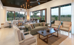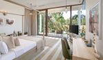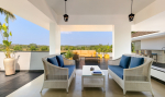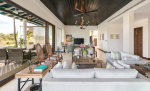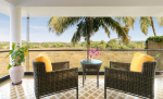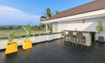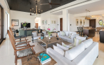 Living Room – You are sure to love this rental property from the moment you step into the house – the modern comforts, luxuries, serene ambiance, lush greenery, and impressive sea views. The living room, in a sparkling white décor, is fantastic. There are several sofas for everyone. Objects of art and designer lamp shades decorate the space. Two walls of this room are made entirely of glass, which opens to a shaded balcony, which has additional seating areas. You will see vast open fields after this.