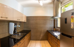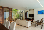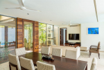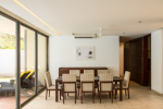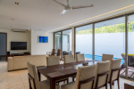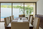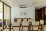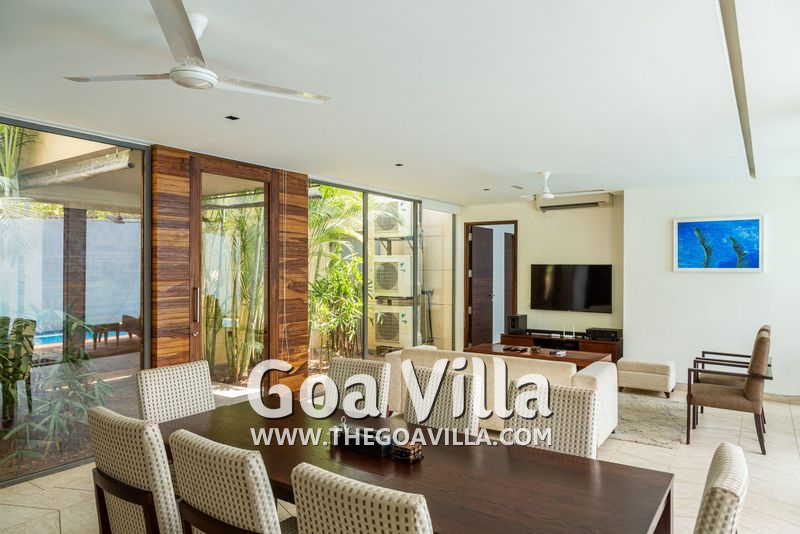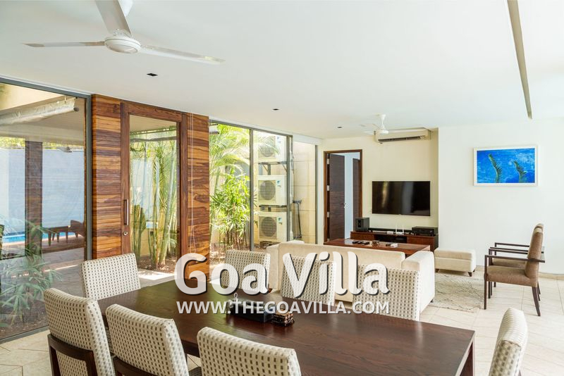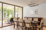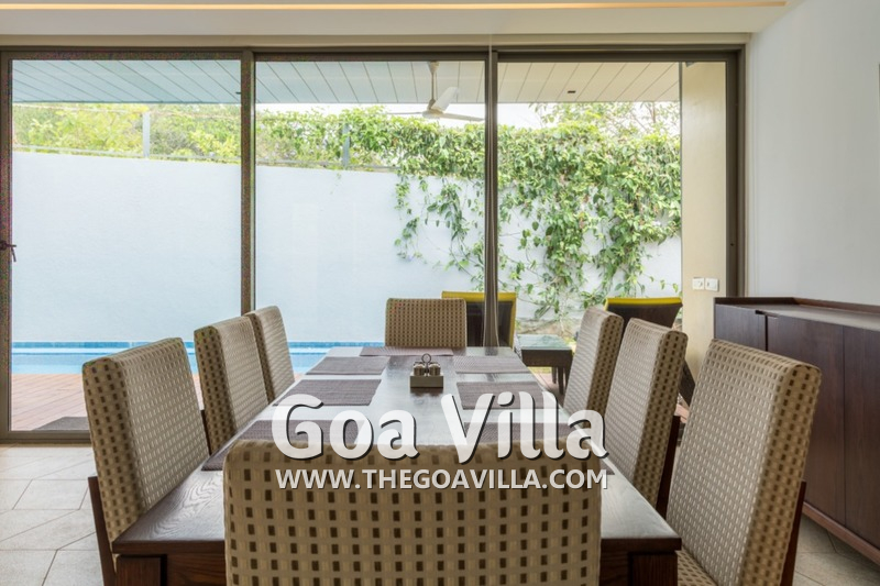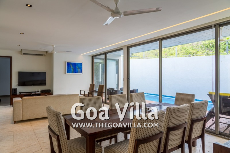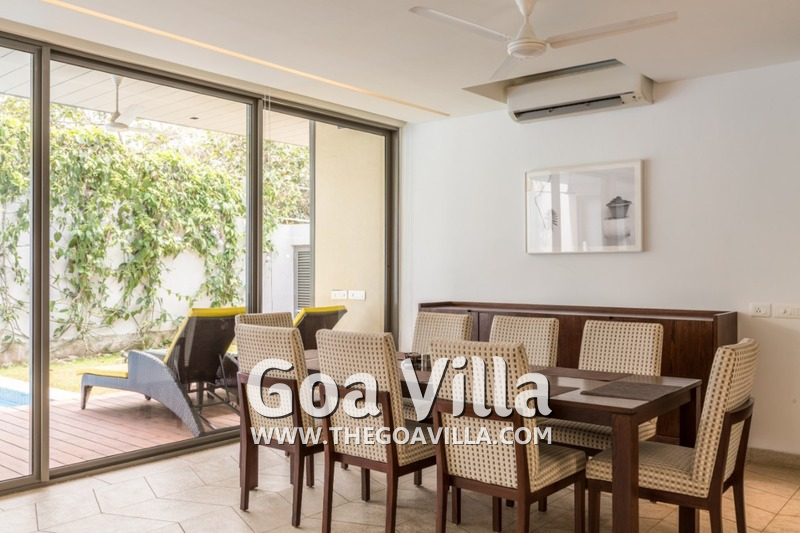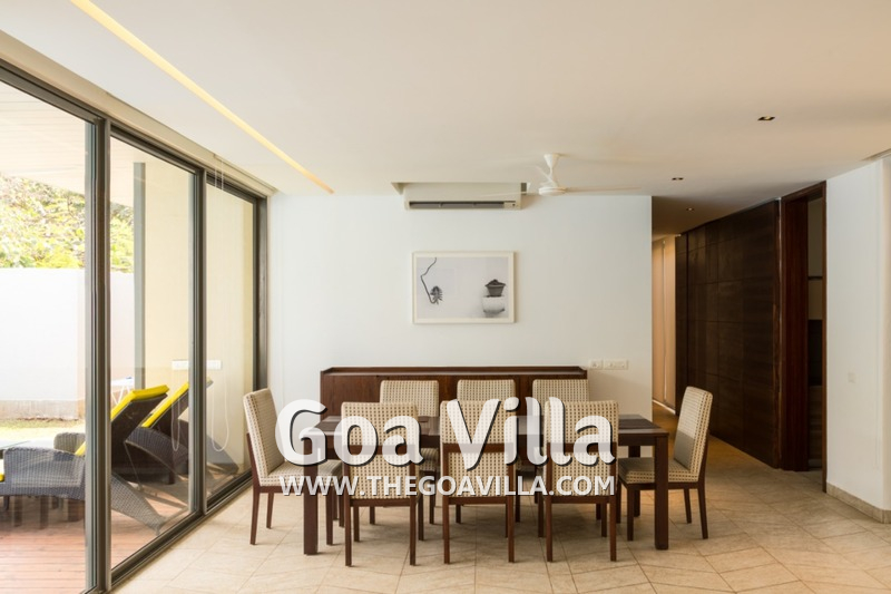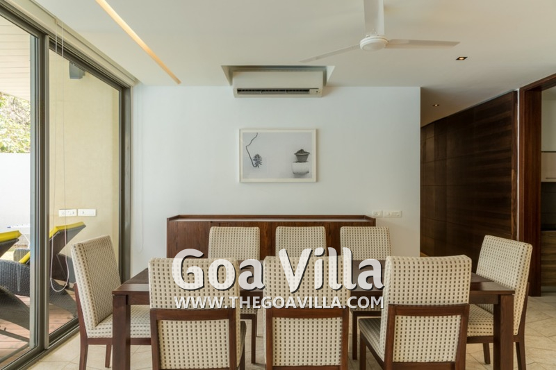 Dining, Kitchen – The dining area is a part of the open-plan living-dining space. It has a table with 8 chairs. This is a large room, but there are multiple A/C units here, so you will stay cool even during the mid-afternoon heat. A second glass door here opens to the pool terrace and lawn. You will find the kitchen close. It has a double-door refrigerator, an oven, water filter, and other appliances. You can cook if you want or you can hire a chef.