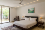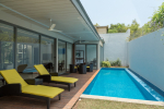Swimming Pool – Almost an entire side of this villa features a private pool. It will be exclusively for your use for the duration of your stay. The pool deck has two loungers where you can relax after a swim, lie back to get a tan, read a book, or leisurely enjoy a drink. Next to this, there are rattan chairs too. On the poolside, you will also find a small grassy lawn.