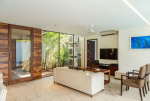 Living Room – The property immediately invites relaxation and peace of mind. It’s cool white walls provide a soothing effect, while the modern furnishing gives comfort to the guests. The living room is positioned between the bedrooms, so you are always close to the common areas. It has deep-cushioned sofas and chairs, which are all centered around the sound system and large-screen television. A glass sliding door from this room leads to the pool terrace.