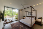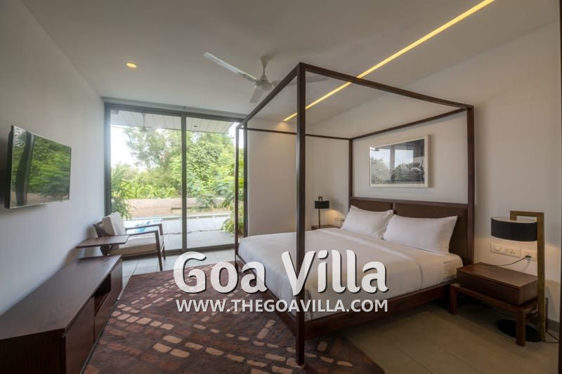 Bedrooms – This North Goa villa for rent has 4 bedrooms for 8 guests. Three of them are ensuite. All the rooms have large king beds with high-quality linen that will help you sleep better. Two feature modern beds, while the others have antique four-posters, for guests with different preferences. All the bedrooms also feature floor-to-ceiling glass sliding doors that either open to the garden, lawn, or the pool terrace. The bedrooms have big wardrobe spaces, seating areas, and televisions.