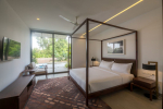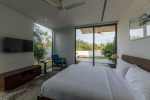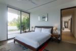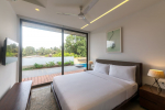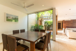 Dining, Kitchen – The dining area is just around the bend in the same room. It has a large table with 8 chairs. Once again, there is a floor-to-ceiling glass panel next to the table that opens to a small garden and the main entry to the house. The well-equipped kitchen in this luxury villa has everything you need to prepare food.