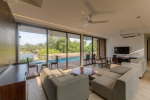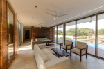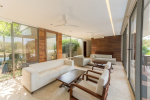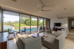 Living Room – Have flawless family time, where comfortable sofas and armchairs keep your holiday nice. The living room features several seating areas for the entire group. It has a state-of-the-art sound system and a large-screen television where you can watch a movie to make the most of your indoor time. Several glass sliding doors from this room open to the pool terrace. Beyond this, you can see the greenery that surrounds the villa.