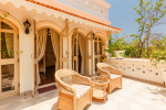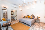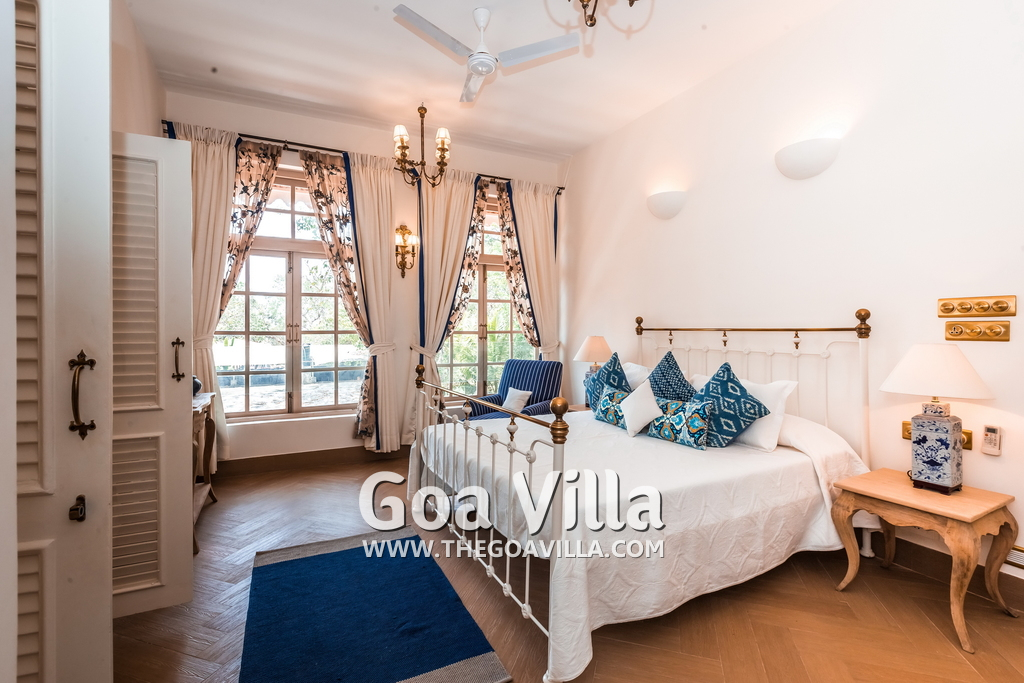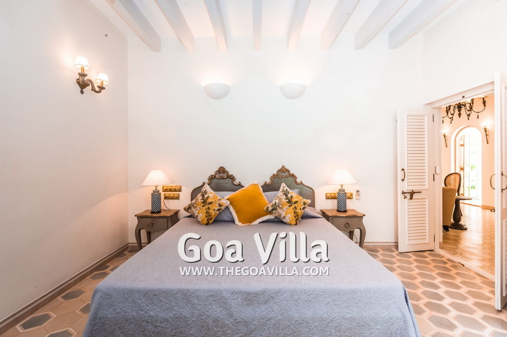 Vila Viva is a 4-bedroom luxury property for rent at Vagator in North Goa. All bedrooms are en-suite and air-conditioned. The villa has an old colonial Portuguese façade, modern interiors with antiques and art, private swimming pool, small garden, porch, leisure area, huge terrace with seating area and an outdoor bar. Soft furnishing. The villa also has a kitchen, dining area, and large comfortable living room. The interiors are lavish and sophisticated.