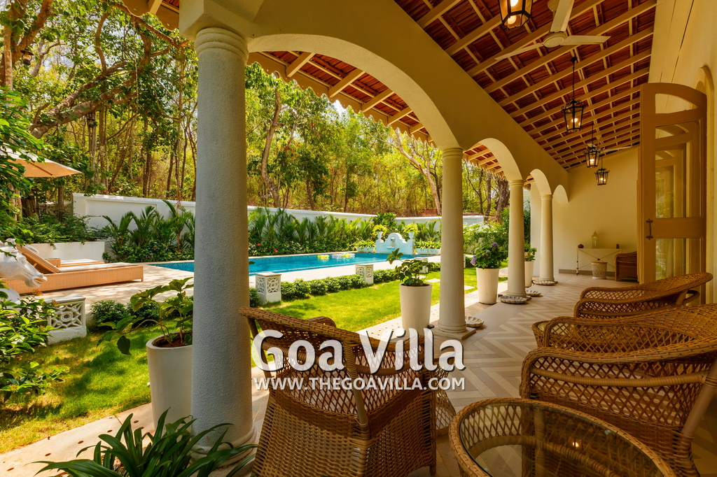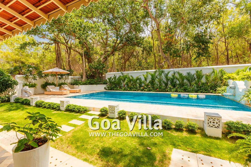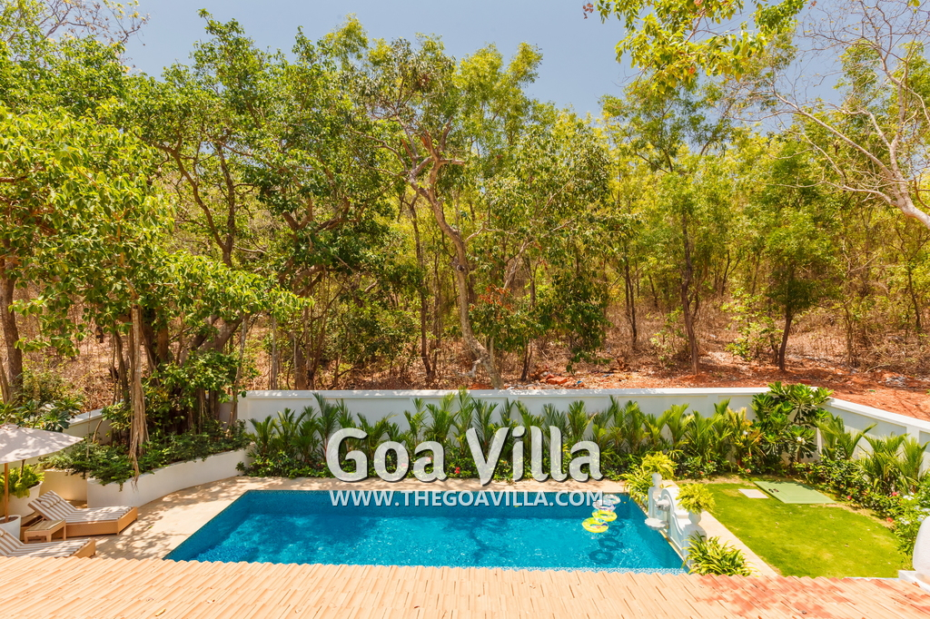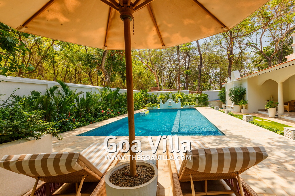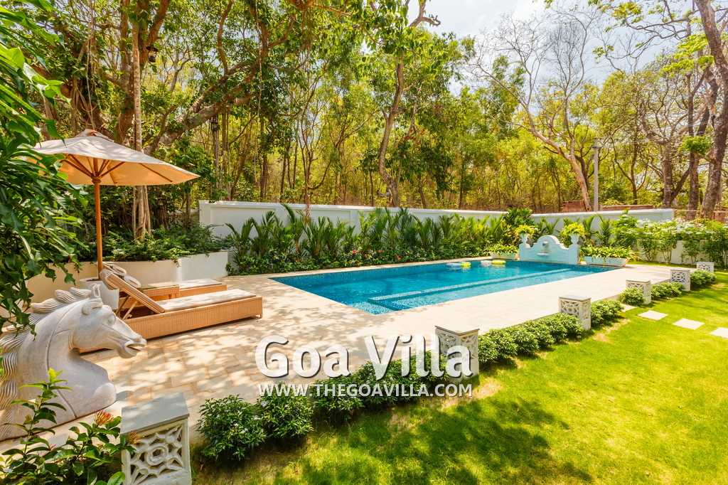One of the finest villas in North Goa, it has 4 en-suite bedrooms with air conditioning. Spread over 2 floors, there is a fully equipped kitchen, a large living room, powder room, porch, terrace, private swimming pool, and small garden. Forest location.