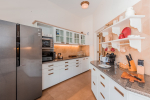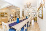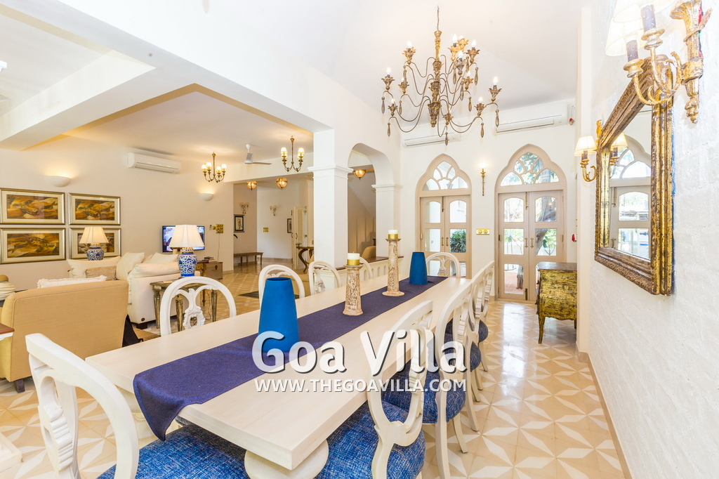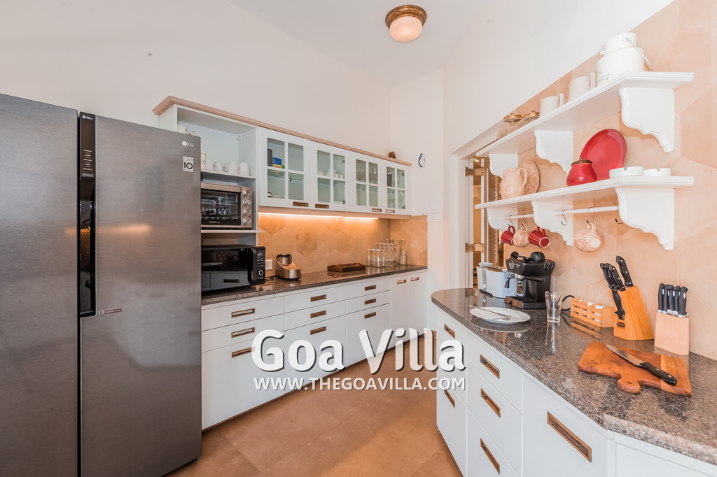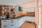 Kitchen, Dining – The villa has a fully equipped kitchen with tea/coffee maker, toaster, kettle, cooking station, chimney, and a big double-door refrigerator. All utensils are provided. The dining area is in one side of the living room. Wooden table with seating for 10 guests. There is a large chandelier overhead.